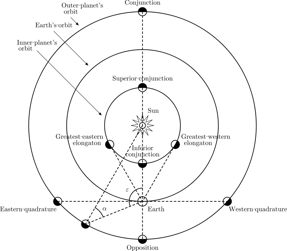 But for an inner planet, like Venus or Mercury, the opposite story unfolds. As we examine the relative motions of the Sun, Earth, and one of the innermore planets, we find that the inner planets orbit at lesser distances and greater speeds than Earth does as these worlds move around the Sun. During most of the time, Mercury and Venus move from east-to-west, where they transition from being “morning stars” (visible in the pre-dawn skies before sunrise) to being “evening stars” (visible in the post-sunset skies).