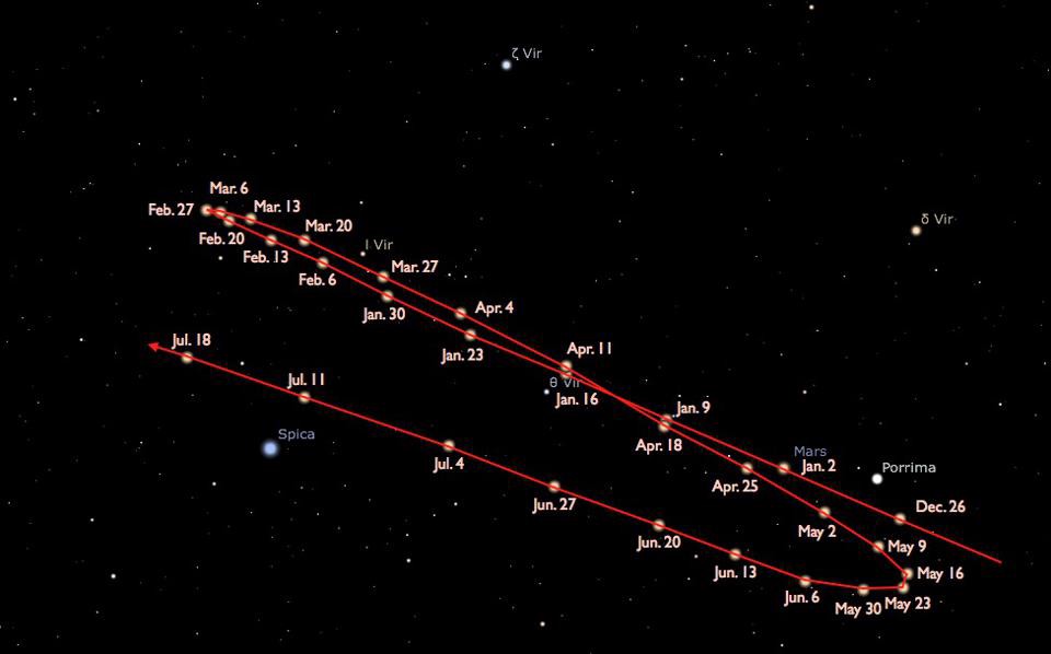 Throughout almost all of the year, you can see planets migrating through Earth’s night sky in the same predictable fashion. Whereas the stars always appear in the same location relative to one another, the planets – being so close by relative to the distant stars – appear to shift from night-to-night. Most of the time, these distant worlds slowly migrate in the same direction: typically from west to east, rising and/or setting slightly later from their relative positions a day earlier.