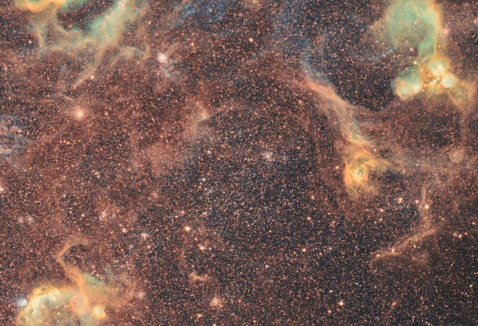 An overlapping region of space to the last one shown, this is nearly the same field-of-view (0.5% of the entire mosaic) but with a set of filters that highlights the presence of hydrogen, sulfur, and ionized oxygen. Note the gas and plasma of the LMC extends far beyond where the visible stars are located. (Credit: Ciel Austral: J.-C. Cannone, P. Berhnard, D. Chaplain, N. Outters & L. Bourgon)