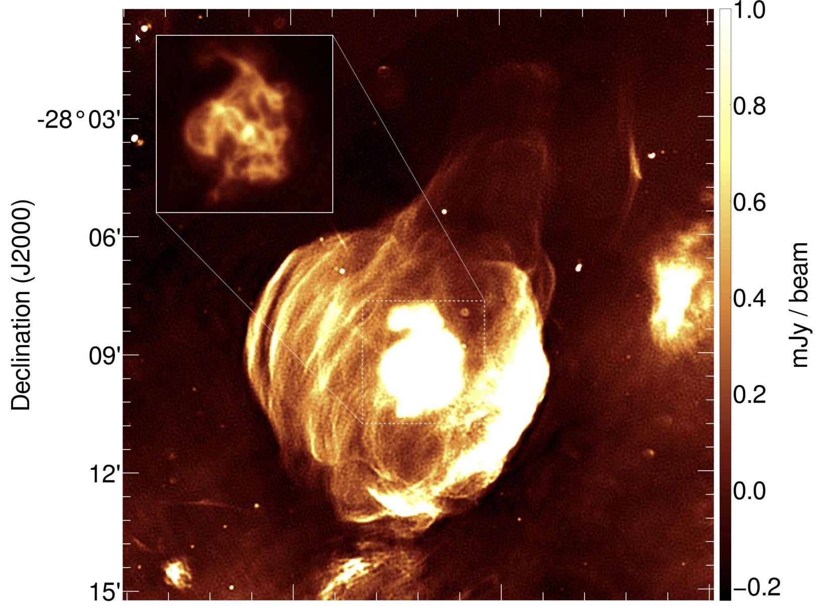 This young, bright supernova remnant, SNR G0.9+0.1, has a series of cocoon-like radio structures surrounding it. One of the science lessons from MeerKAT data shows us how supernovae evolve in the radio as they age. (Credit: I. Heywood et al., 2022, ApJ)