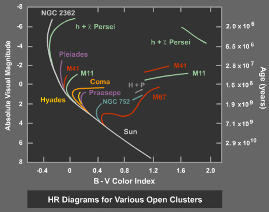 But as stars age, something spectacular happens. You might have heard the expression, “the flame that burns twice as bright lives just half as long,” but for stars, the situation is even worse. A star that’s twice as massive as another lives only one-eighth as long; a star’s lifetime on the main sequence is inversely proportional to the cube of its mass. As a result, the hottest, bluest stars burn through their fuel the fastest, and evolve off of that main sequence diagram. In fact, we can put together the age of any stellar population that formed all at once simply by looking at its color-magnitude diagram. Wherever that “turn-off” from the main sequence is, that’s how we can identify how long ago this population of stars formed.