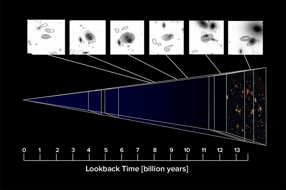 At the earliest times, starlight from the first luminous objects would be blocked by the neutral matter permeating space at that time. But by measuring longer-wavelength signatures, such as those emitted by carbon monoxide molecules in the gas, distant galaxies can be seen by other observatories, like ALMA, that ultraviolet, optical, and near-infrared observatories would otherwise miss. (Credit: R. Decarli (MPIA); ALMA (ESO/NAOJ/NRAO))