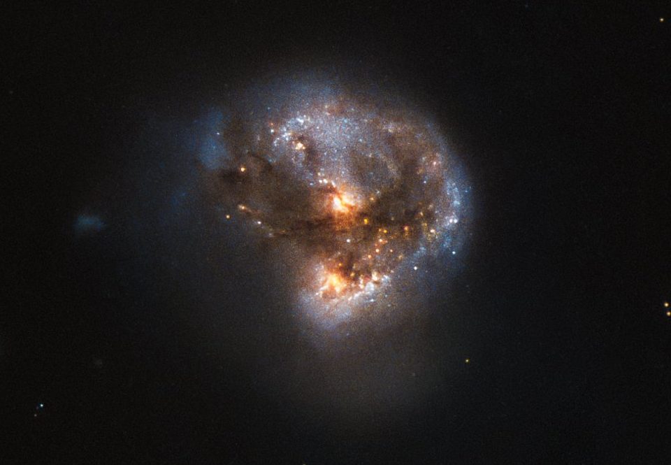 Arp 220 itself is the result of two precursor galaxies that collided just a few hundred million years ago, which now find themselves in the process of merging. A massive, recent burst of star-formation has occurred all throughout the galaxy: evidence of a starburst event. Hubble has imaged the central core of this galaxy, revealing hundreds of massive young star clusters, with the most massive containing around ten million solar masses worth of material: about 250 times more massive than the largest star-forming region in our Local Group. Arp 220 also contains two bright masers, with one being a hydroxyl maser and the other being a water maser, and an enormous amount of neutral gas: billions of solar masses worth.