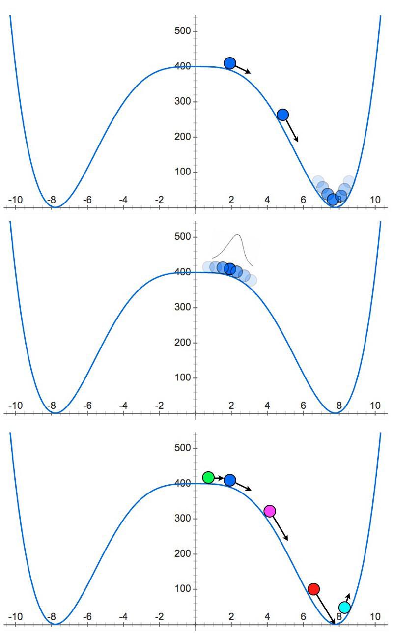 In actuality, however, we know that whatever field drives inflation is overwhelmingly likely to be quantum in nature. That means, as inflation goes on, there’s a certain probability that the field will: “roll” into the valley where inflation ends; a certain probability that it won’t and inflation will continue; and even a certain probability that the field will “roll” in the wrong direction, taking us farther away from inflation’s end. And — here’s the counterintuitive part — because the inflating universe continuously creates new space, all of these possibilities can occur simultaneously in different regions of the inflating universe.