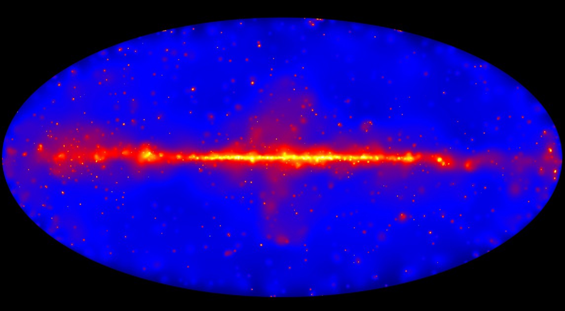 For those of you who’ve seen all-sky maps before, you might notice that this looks a lot like the most recent all-sky map posted in the infrared, by NASA’s Wide-field Infrared Survey Explorer (WISE) spacecraft. As you can see by looking above (at the gamma-ray sky) and below (at the infrared) sky, both show evidence of fine, gaseous structure around the galactic plane, large nebulae at various locations along the Milky Way itself, and bubbles of gas perpendicular to the galactic nucleus.
