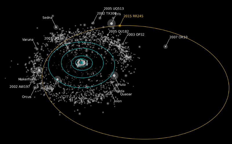 2015 RR245 is larger than every world in the asteroid belt except Ceres. It may be smaller than Pluto, Eris, Makemake, Haumea, Quaoar and Sedna, but it’s suspected to be approximately the same size as Varuna, all of which are either confirmed or candidate dwarf planets. By surveying a portion of the sky at incredibly high resolution just a few hours apart, they were able to detect the very slight motion of this distant world against the backdrop of fixed stars.