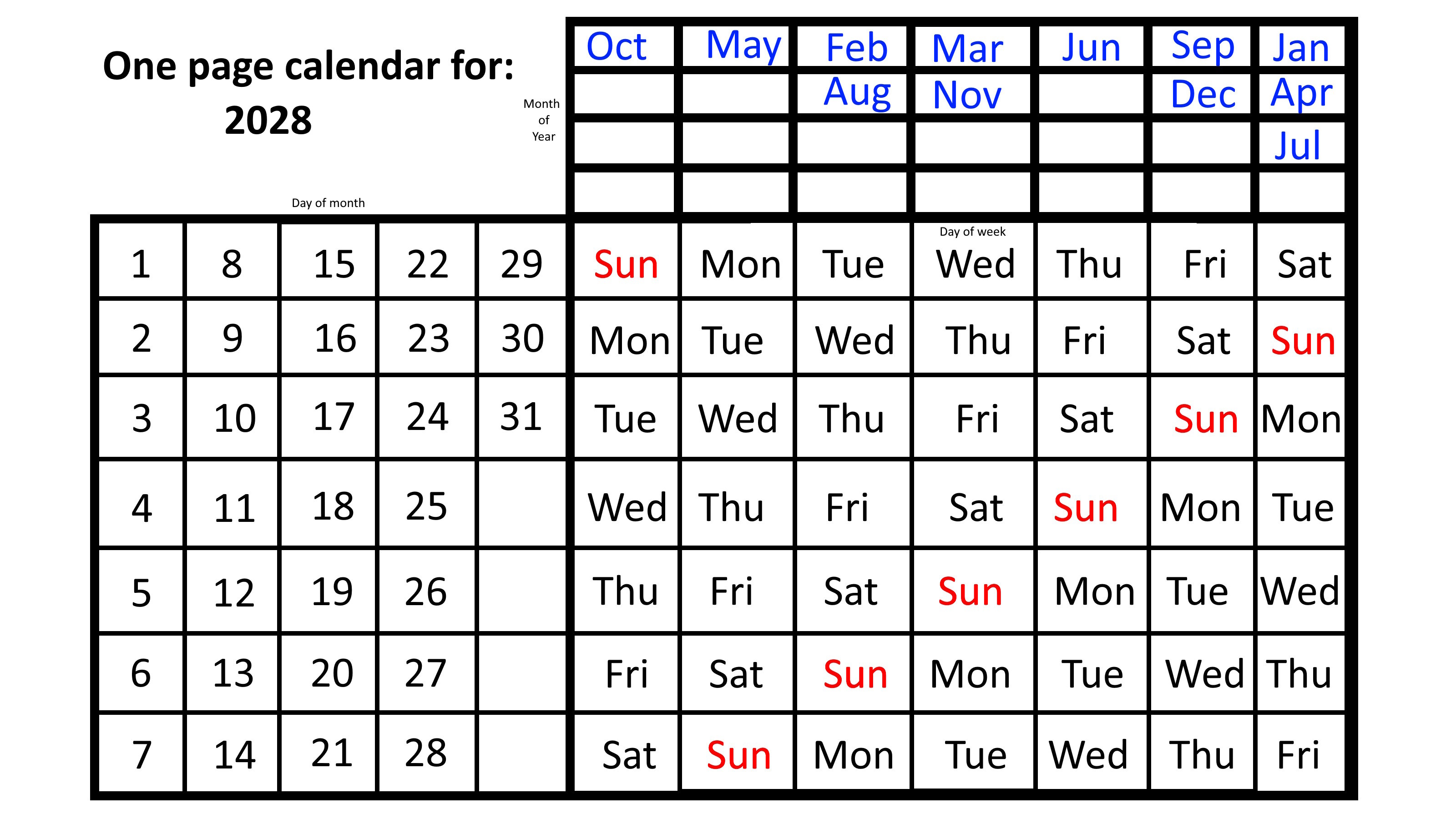 Above, you can see the 2025 iteration of a one-page calendar. On the lower-left, you can see the days of the month, which works for all months equally well, so long as you know that: