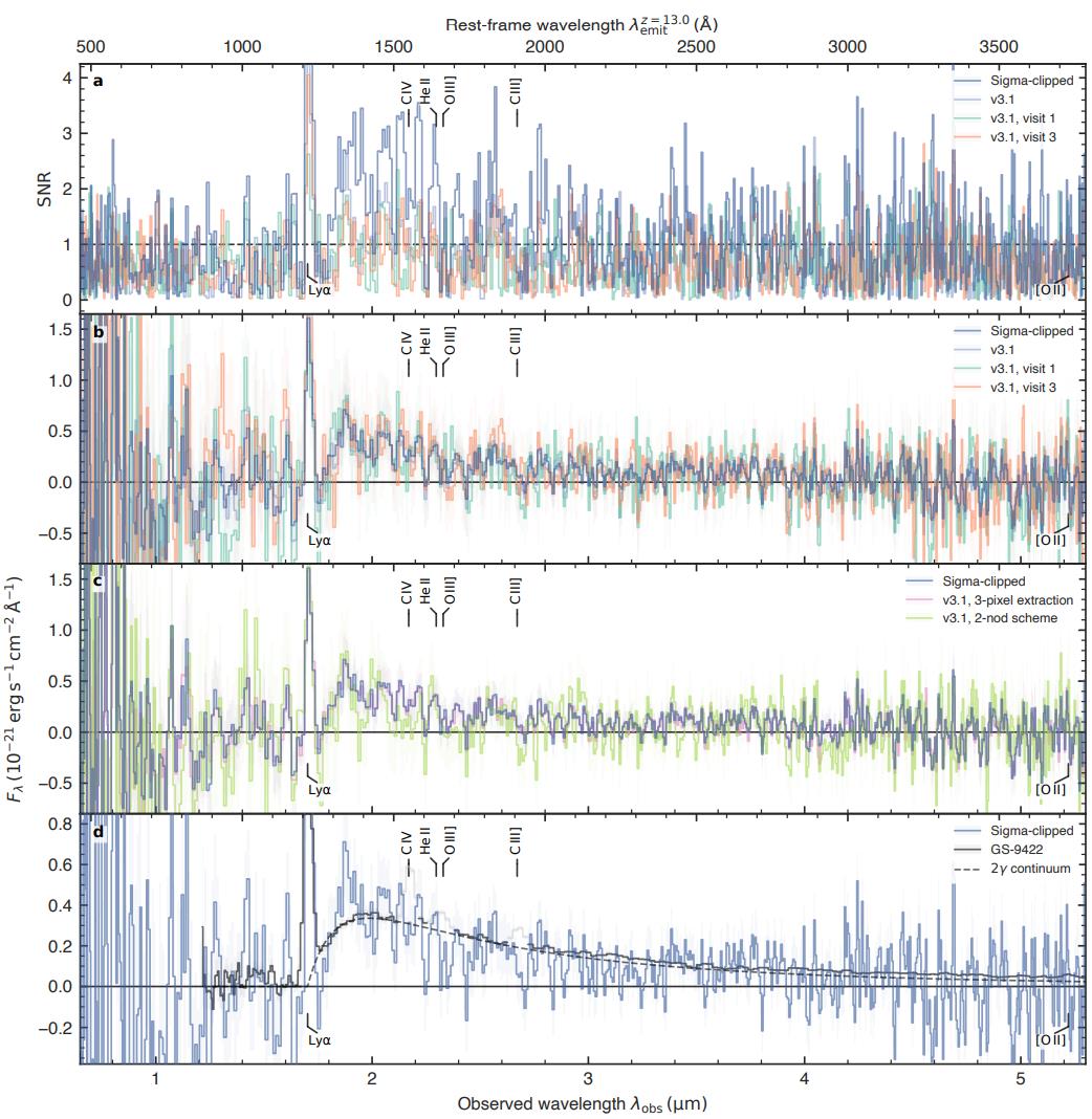 A variety of spectral features can be teased out of the NIRSpec/PRISM spectra of JADES-GS-z13-1-LA. The enormous emission line at ~1.7 microns is due to Lyman-alpha, but elsewhere, carbon, helium, oxygen, and carbon lines can all be seen as well. The enormous hydrogen emission line is unique to this object; no other JWST-imaged object from the first ~500 million years of cosmic history has one.