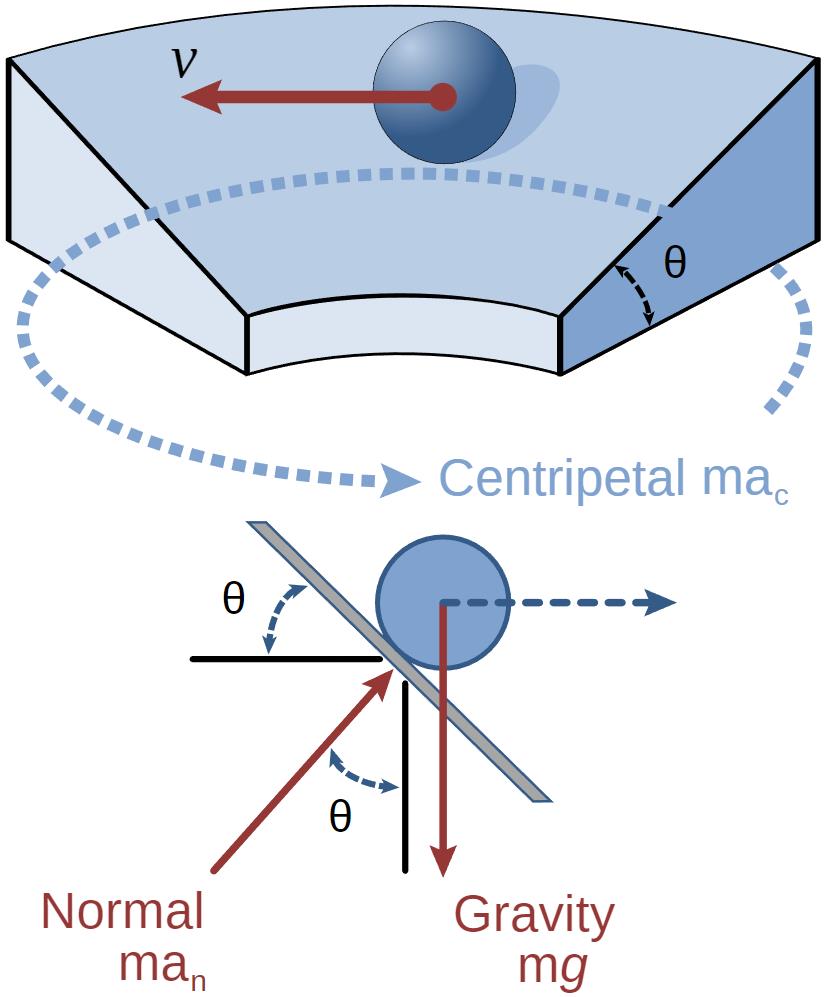 So he went with an alternate strategy: let the outside wall, which he’s going to collide with anyway, provide that needed, additional centripetal force. With his car up against the outside wall, he could run his engine at full throttle, achieving the maximum velocity possible for his car. With the inward push of the wall against the car combining with the frictional force from the tires, the car will successfully navigate through the turn. There are only two big risks with this strategy: