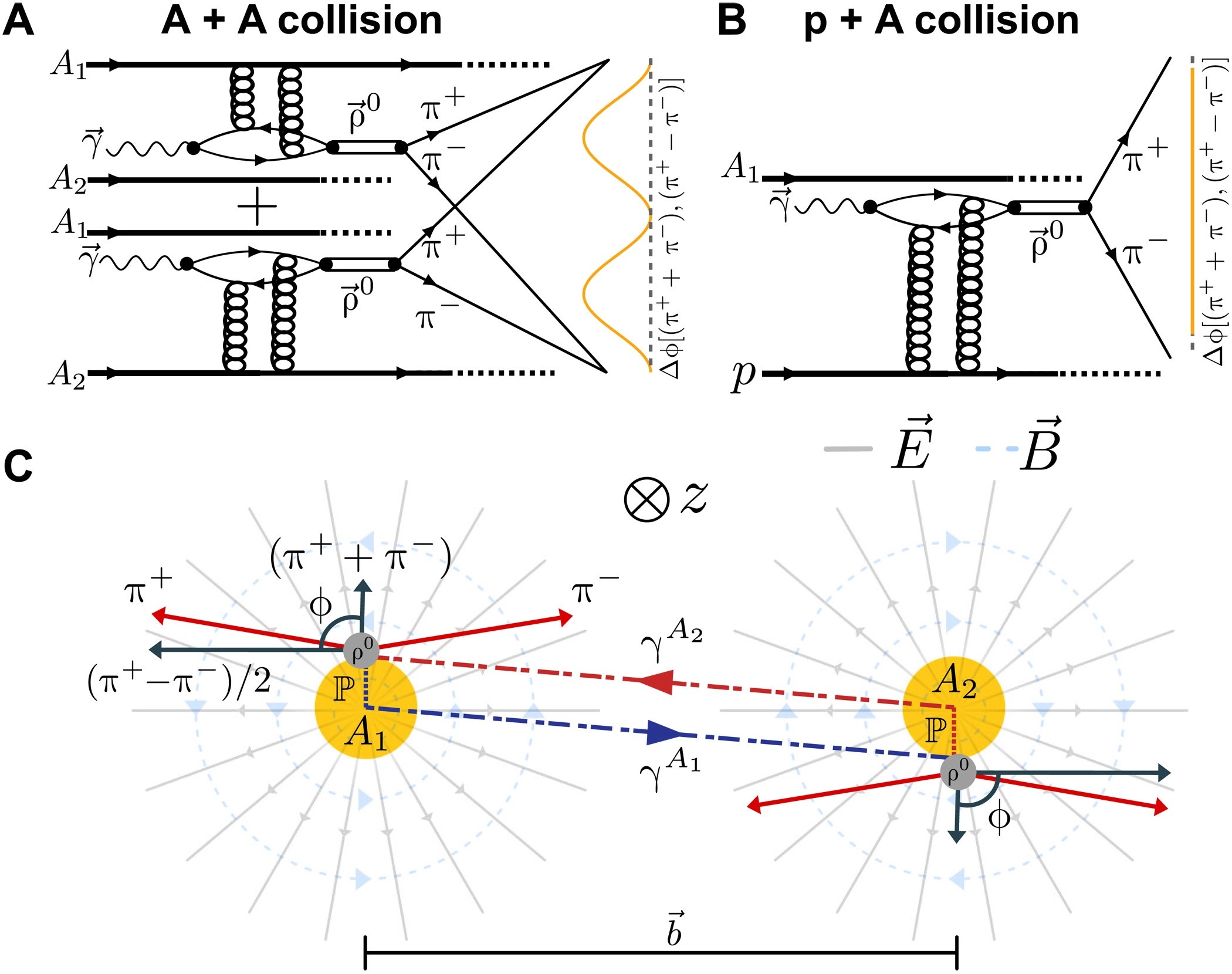 This schematic shows the creation of rho particles and how they decay, and how this signal shows up in Brookhaven’s STAR detector. This experiment was the first to measure a new type of quantum entanglement.
