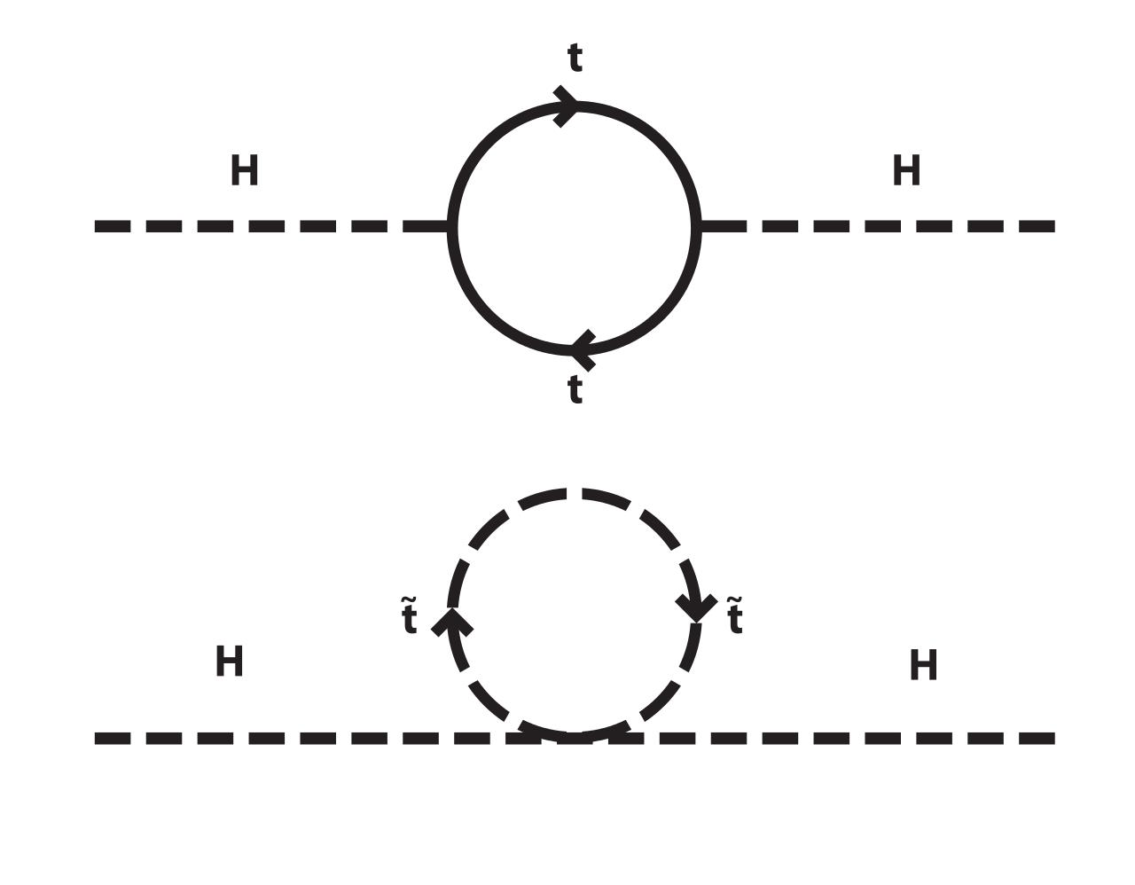 For example, in the above diagram, you can see the top quark correction to the Higgs boson mass coming in the upper loop diagram. The Higgs boson and top quark are both heavy particles, so this virtual process should help add to the mass of the Higgs boson. Even worse: the more particles and the more loops you allow your diagrams to have, the greater and greater the expected mass of the Higgs becomes. In the Standard Model, alone, this is truly a pathology.