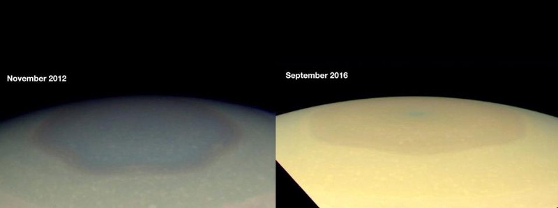 From 2012 to 2016, the hexagon was seen to change color, from bluish to yellow, where it now better matches the rest of Saturn’s color.