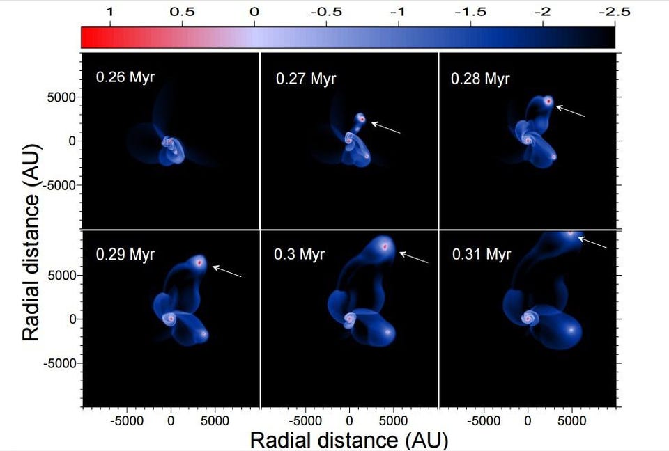 Particular configurations over time, or singular gravitational interactions with passing large masses, can result in the disruption and ejection of large bodies from solar and planetary systems. In the early stages of a solar system, many masses are ejected just from the gravitational interactions arising between protoplanets, but in the late stages, it’s only random encounters that cause planetary ejections, and those are rarer than the ones that will eject entire solar systems. (Credit: S. Basu, E. I. Vorobyov, and A. L. DeSouza; arXiv:1208.3713)