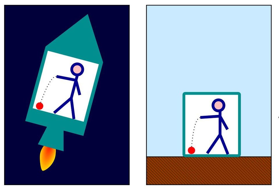 The identical behavior of a ball falling to the floor in an accelerated rocket (left) and on Earth (right) is a demonstration of Einstein’s equivalence principle. Measuring the acceleration at a single point shows no difference between gravitational acceleration and other forms of acceleration; unless you can somehow observe or access information about the outside world, these two scenarios would yield identical experimental results. (Credit: Markus Poessel/Wikimedia commons; retouched by Pbroks13)