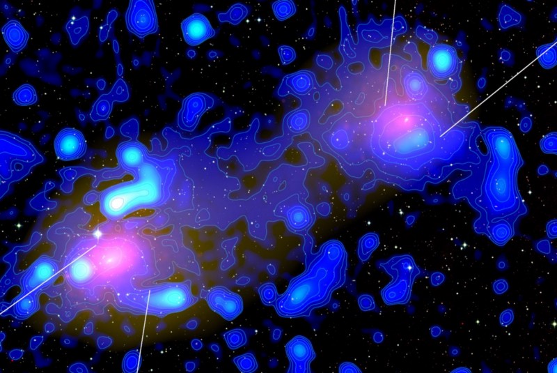 This radio ridge is also larger than most naive simulations predict, but that’s an extremely good thing for dark matter theories. The big puzzle for some of the colliding clusters we’ve observed is to explain how these particles can accelerate to such large speeds. Meanwhile, this enormous magnetic field and electron bridge between the two clusters suggests a mechanism to re-accelerate the particles present in the intergalactic gas: shock waves generated in the merger.