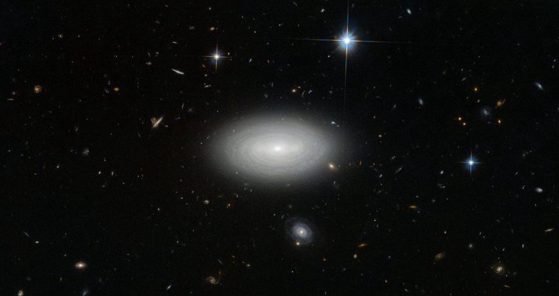 Although a long-exposure, deep image of MCG+01–02–015 appears to show many other galaxies in its vicinity, most are far more distant (and a few are closer), but none are within 100 million light-years of the major galaxy itself. (ESA/HUBBLE & NASA AND N. GORIN (STSCI); ACKNOWLEDGEMENT: JUDY SCHMIDT)