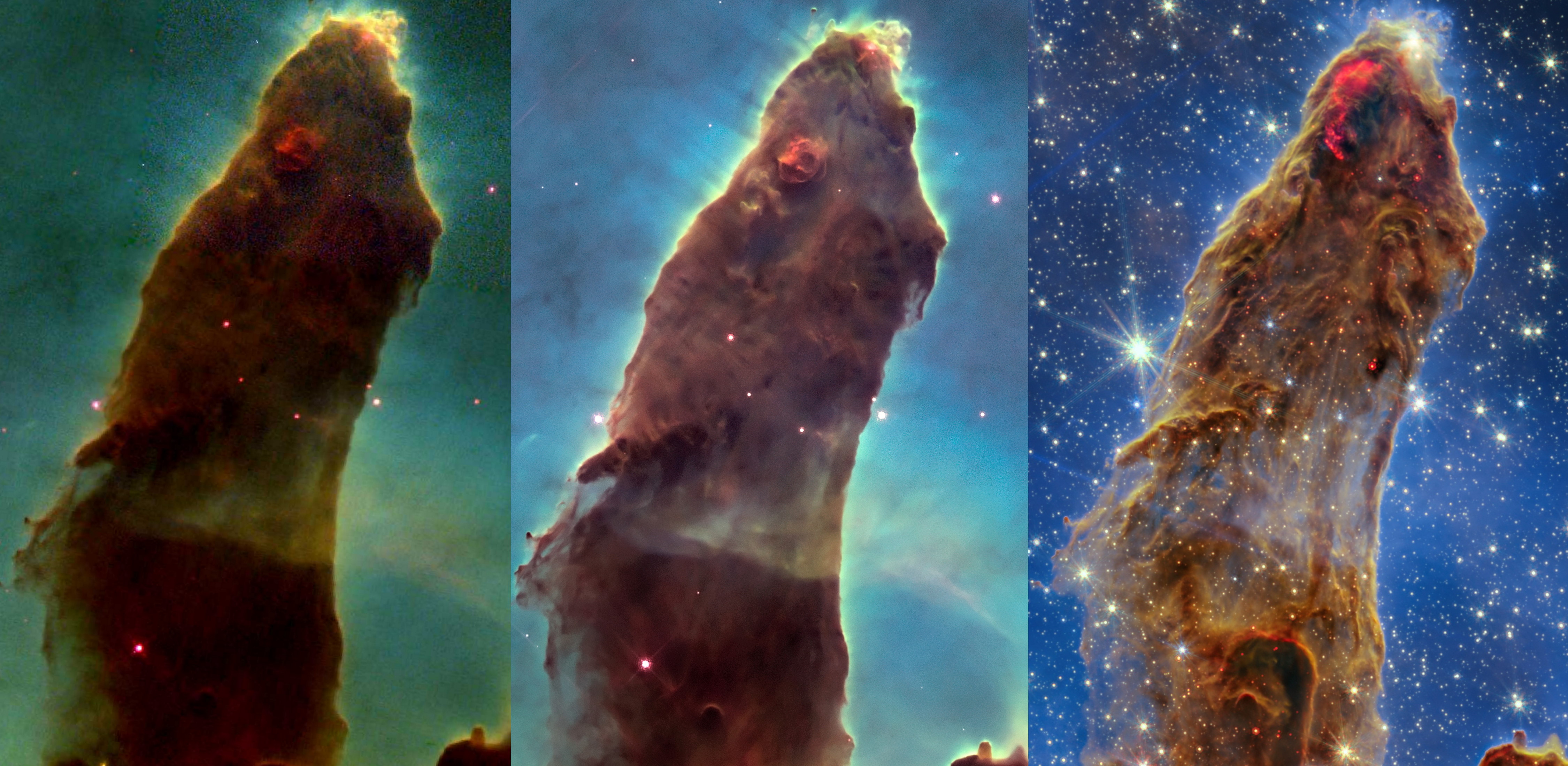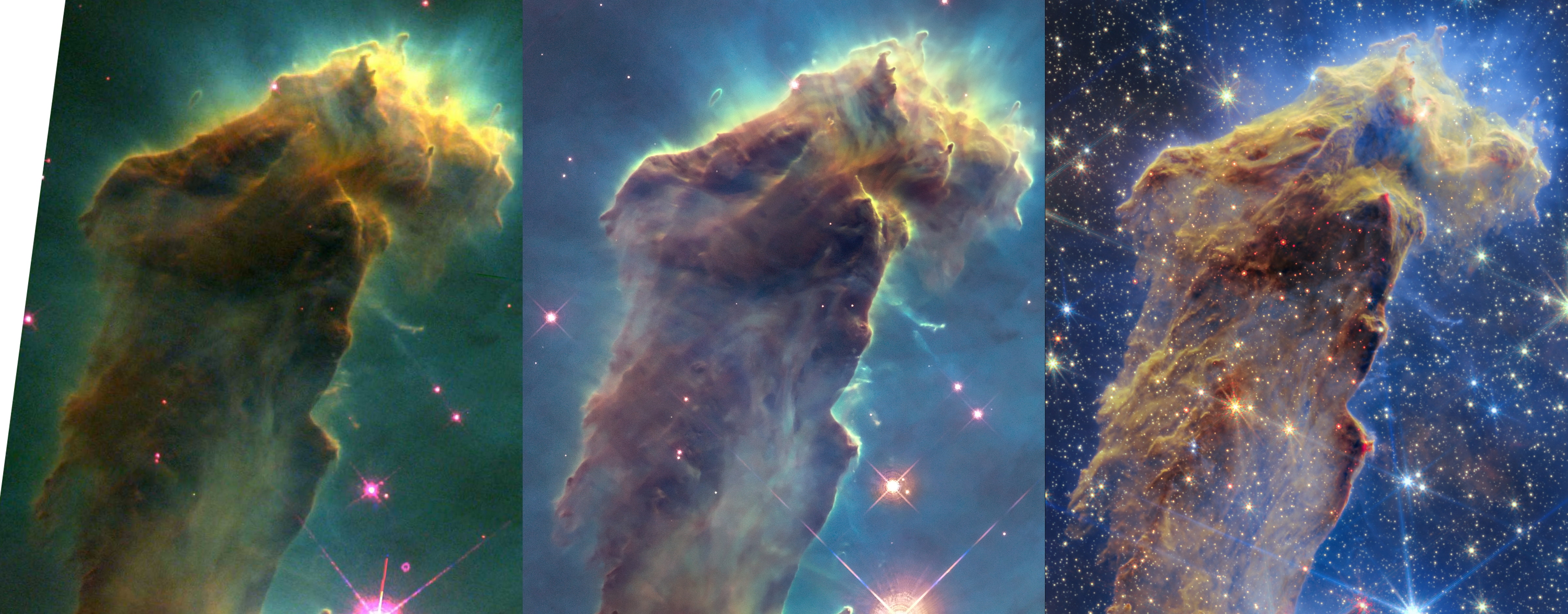 You can also see how the wispy features seen in the Hubble images translate into fine filaments and excel at reflecting light, particularly shorter-wavelength light, when viewed by JWST. This pillar is not only evaporating, but the JWST view shows how thin and tenuous the pillar is over much of its volume, a feature that cannot be seen with Hubble’s limited wavelength coverage alone.