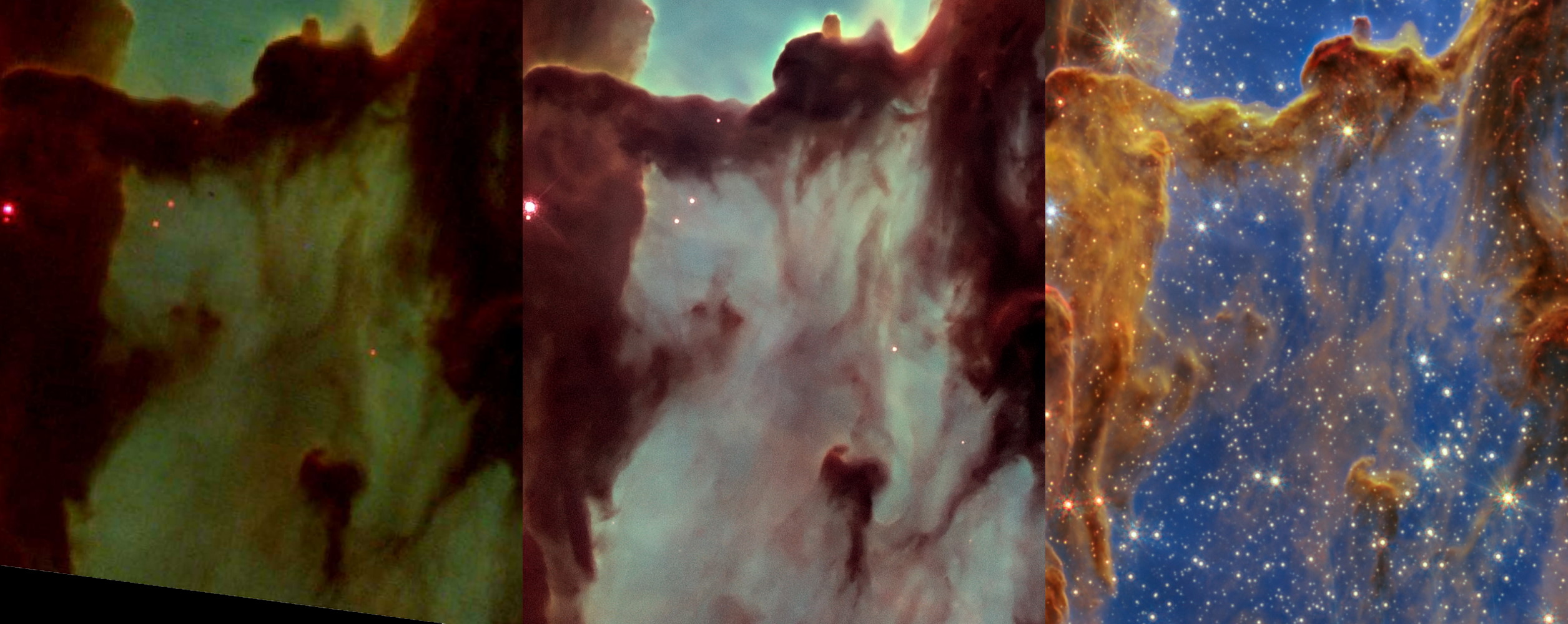 Again, the brightest stars seen by JWST’s eyes are not the same as the brightest stars as seen by Hubble’s eyes. While the pillar appears mostly monolithic to Hubble, the gassy details, and the eroding nature of the material, are clearly revealed by JWST. The differences toward the lower half of the image are exceptionally striking, as gaseous knots and internal stars, particularly reddened by the densest clumps of dust, are revealed in great detail by JWST and not by Hubble.