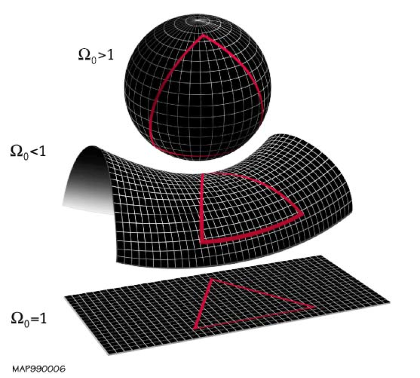 The analysis we just covered only applies if space has two specific properties that we know it does not actually possess. For starters, space would need to be flat: like a three-dimensional Euclidean grid. Flatness can be defined for any general space, and the way you can tell whether your space is flat or not is by picking three points and connecting them by drawing three lines to make a triangle. You then add up the three interior angles of the triangle that you just drew and compare the result to what you would get if you simply drew a triangle on a flat piece of paper: 180°.