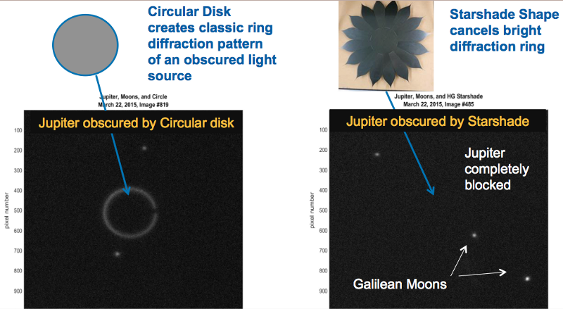 The key to all of this is collecting light from the planet without having that light swamped by the star itself. You might think that by simply blocking out the star’s light with a small disk, something called a coronagraph, we’d be able to do exactly that. It’s true that we use coronagraphs in astronomy to great effect, but light has the unfortunate property (since it behaves as a wave) that it diffracts around any object, including a coronagraph, and that the amount of diffracted light that slips through would swamp any signal from a planet that’s many billions of times fainter than the star it orbits. Yet there’s a beautiful optical trick we can use to block the star’s light entirely: by putting a perfectly shaped optical object of the right size a long distance away from the telescope’s lens. In other words, the solution to seeing a faint planet isn’t itself a task for a more powerful telescope, but for a special light-blocking “shade” for a telescope, the same way the Moon shades us on Earth during a total solar eclipse.