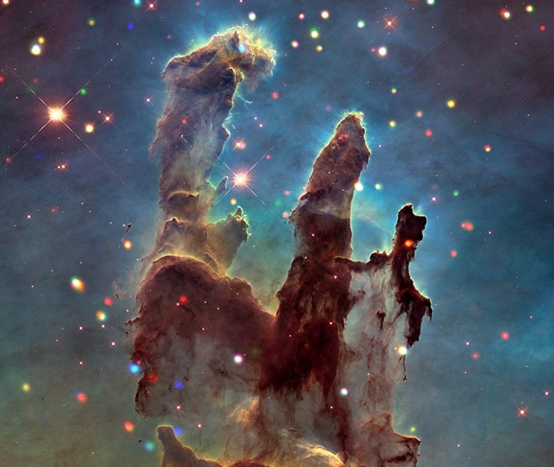 The Pillars of Creation, 7,000 light years away in the Eagle Nebula, represents one of Hubble’s most iconic images.