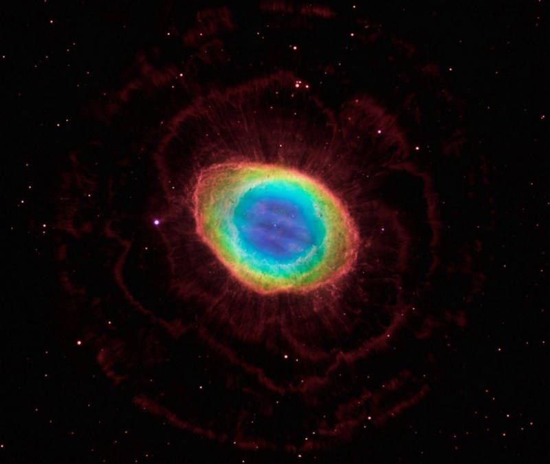The red outer shells are signs of ionized hydrogen gas, huge and intricate outside the ring itself. Sulfur and Oxygen ions, expelled from the star and prominent in the ring area, are viewed in the other colors shown here. (D. López (IAC), which is A. Oscoz, D. López, P. Rodríguez-Gil and L. Chinarro)