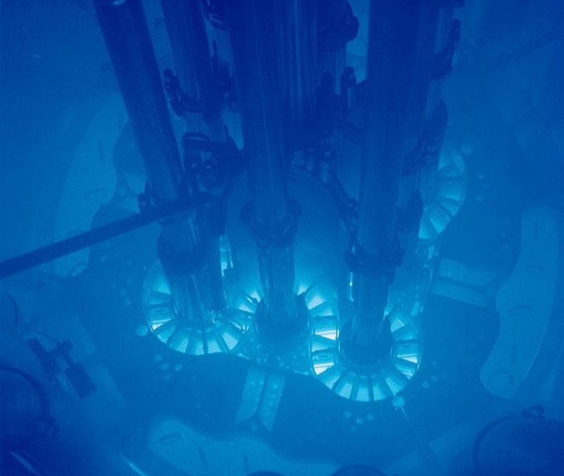 Čerenkov radiation characteristically appears as a blue glow, and gets emitted whenever a charged particle travels faster than light in a particular medium. It’s most commonly seen, as above, in the water surrounding nuclear reactors. The reactions inside cause the emission of high-energy particles that move faster than light in water, but substantial amounts of water surround the reactor in order to shield the external environment from the harmful emission of radiation.