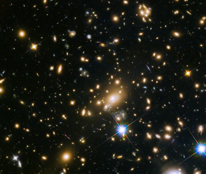 This NASA/ESA Hubble Space Telescope image shows a massive galaxy cluster, PLCK_G308.3–20.2, glowing brightly in the darkness. It was discovered by the ESA Planck satellite through the Sunyaev-Zel’dovich effect — the distortion of the cosmic microwave background radiation in the direction of the galaxy cluster by high-energy electrons in the intracluster gas. The large galaxy at the center is the brightest galaxy in the cluster, and above it a thin, curved gravitational lens arc is visible. This is what huge swaths of the distant Universe looks like. (ESA/HUBBLE & NASA, RELICS; ACKNOWLEDGEMENT: D. COE ET AL.)