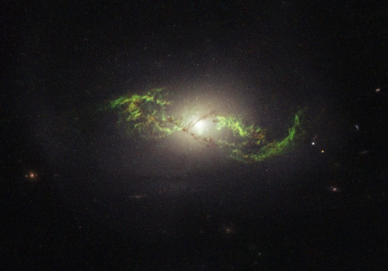 One of these Voorwerpjes clearly shows that the green illumination is coming from gas well outside the main galaxy, which itself shows evidence of new star formation and activity near its core. There are many regions rich in this green emission that do not have identifiable stars in them. (NASA, ESA, W. KEEL (UNIVERSITY OF ALABAMA), AND THE GALAXY ZOO TEAM)
