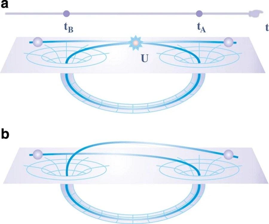 Why is a traversable wormhole so important to the idea of time travel? Because once you’ve created the two “ends” of the wormhole, plus forged and maintained the connection between them, then no matter how far apart you subsequently take these two connected objects from one another, with sufficient mass/energy — of both the positive and negative kind — this instantaneous connection will eternally remain. All of that is great for instantaneous travel through space, and by leveraging the laws of special relativity together with this general relativistic phenomenon, we can extend it to traveling through time as well.