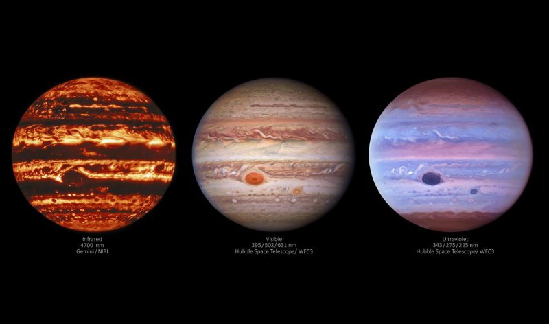 This composite image of Jupiter has been edited to show three separate wavelengths at once. At left, the infrared view of the planet from Gemini North appears. In the center, the features seen in visible light are present. And at right, the Hubble Space Telescope’s ultraviolet view comes out. All three images were taken simultaneously on January 11, 2017. (INTERNATIONAL GEMINI OBSERVATORY/NOIRLAB/NSF/AURA, M.H. WONG (UC BERKELEY) ET AL.; ACKNOWLEDGMENTS: M. ZAMANI; EDITS: E. SIEGEL)