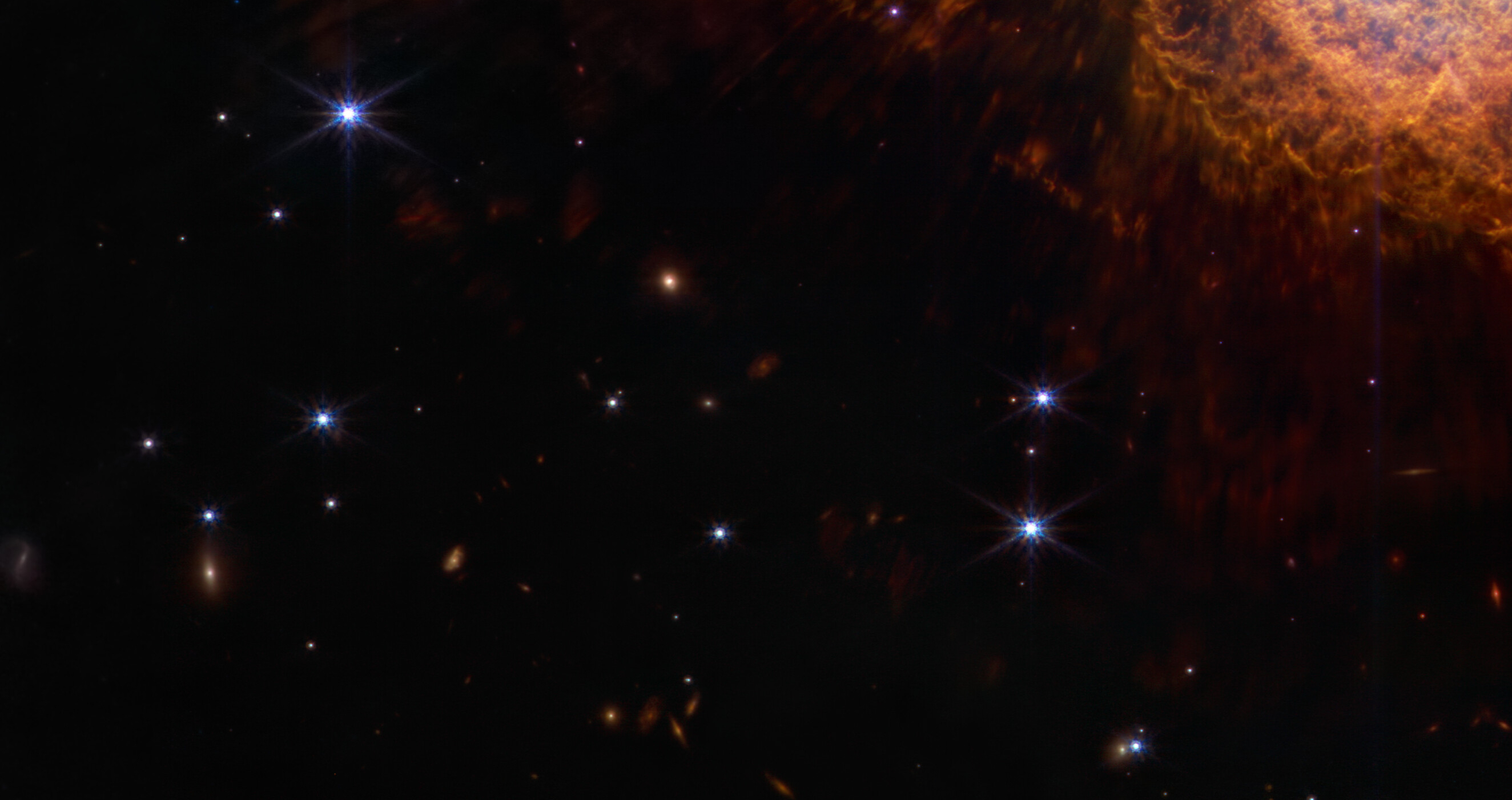 On the less dusty side of the Cosmic Cliffs in the Carina Nebula, a number of faint, extended objects can be identified among the glittering stars that populate the majority of this region of space. Even in the galactic plane, where star densities are greatest and neutral matter abounds, background galaxies are copious, and will likely appear in practically every JWST image to come.