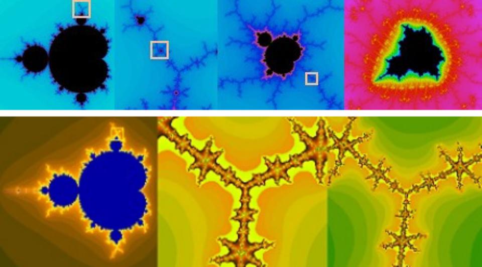 The way the Mandelbrot set is visualized is by representing the border between what’s actually in the set versus what’s outside of it, with color coding showing how far away something is from being a member of the set. (Brighter colors are closer to being in it.) As you can see, many of the patterns that emerge are intricate and self-repeating.