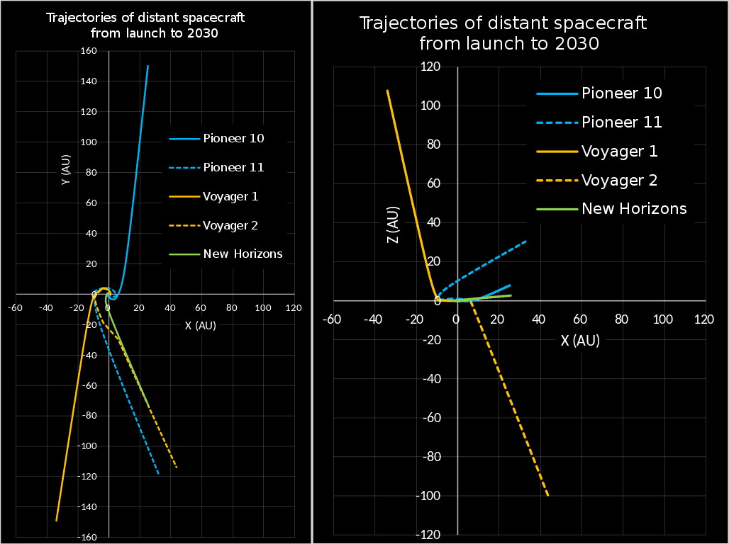 The Voyager spacecraft, illustrated here, are two of the five spacecraft currently on trajectories that will take them out of the Solar System. Both spacecraft actually left the heliosphere behind and entered interstellar space in the 2010s, and will, when Voyager 2 passes Pioneer 10 in 2023, become the two most distant spacecraft from Earth for the foreseeable future.