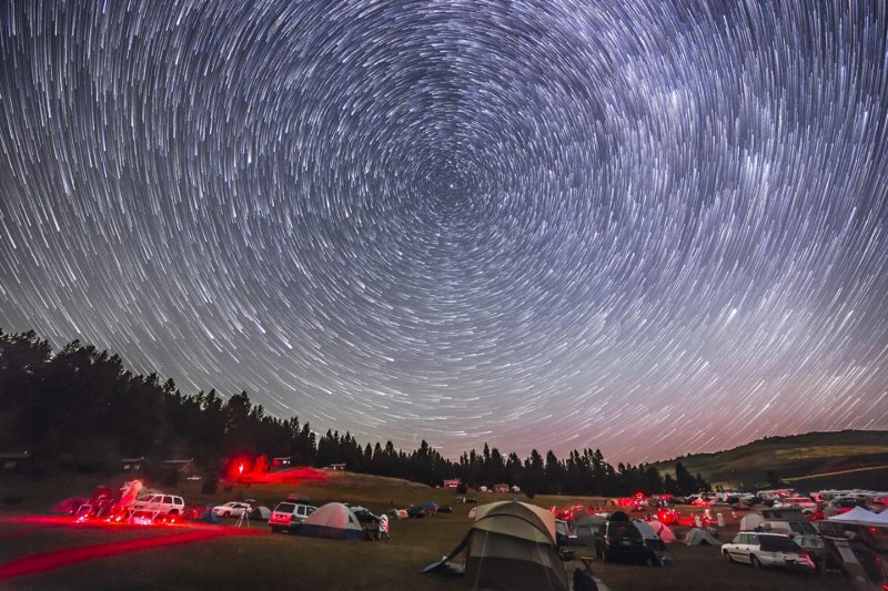 A timelapse series of photos stitched together shows the stars of the northern hemisphere rotating over multiple hours around the celestial north pole. Polaris, the bright star closest to the pole, only rotates slightly, while the stars of the Big Dipper (at right) rotate significantly, as they are farther from the pole. (Alan Dyer /VW PICS/Universal Images Group via Getty Images)