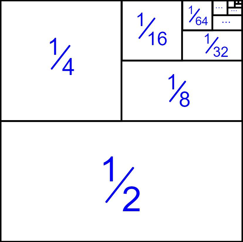 - Therefore, [2 * (series) – (series)] = 1 + (½ + ¼ + ⅛ + …) – (½ + ¼ + ⅛ + …) = 1.