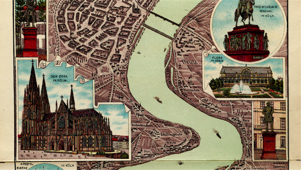 But for the giant twin spires of its famous Dom, Cologne looks tiny on the map-crowning panorama. On the bird’s-eye section below, Germany’s western metropolis looks positively rustic. Yet records show that the city’s population broke the half-million mark around 1910, right about when this map was published. Depicting Cologne as a middling city must have fitted with the general conceit of the map: to present the Rhine valley as a semi-rural idyll.