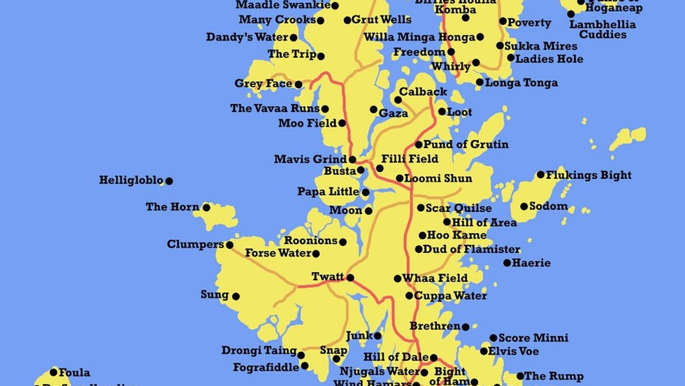 Mencken goes on to list such curious examples as Chemquasabamticook, Jackass Flat, Big Chimney, Stumptown, Matrimony, Walla Walla and Cement. As the lexicographer of the American tongue, he may be forgiven for repeating Stevenson’s claim. But the Scottish writer himself should have known better: surely, the greatest density of strange place names per square mile occurs in a small corner of his own country – two archipelagoes off Scotland’s northern coast: the Orkney Islands and the Shetland Islands.