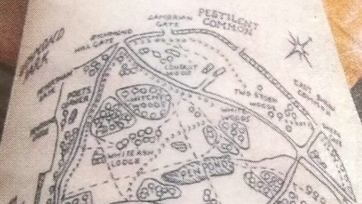 A few other areas have been marked with new names, no doubt reflecting Ms. Pinney’s own experiences in the park. Sidmouth Wood has been renamed Witchy Woods on her map, and what looks like Saw Pit Plantation is now White Woods. Pesthouse Common has been slightly altered into Pestilent Common.