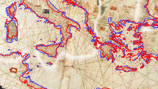 In blue: portolan shorelines; in red: actual shorelines. A close match in the Mediterranean and Black Seas, wildly off the mark in the British Isles and the Baltic.