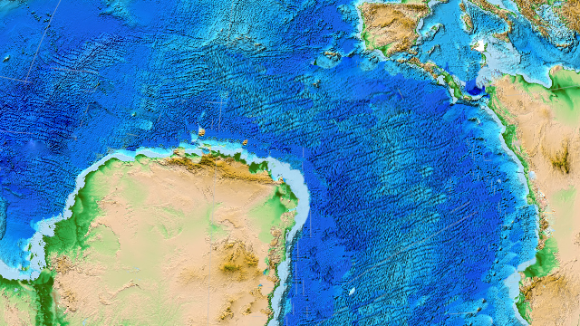Looking at the region’s tectonic structure, the split as it did happen is puzzling: the West African Rift System shaped the African-South American split from both continent’s southern edges right up to Cameroon (and Brazil’s easternmost cape), but the rift itself then continues northward, from roughly where Nigeria is to Libya. This would have been the logical place for the rest of the split to occur. The result would have been not one Atlantic Ocean, but two distinct bodies of water, separated by Sahara-Brazil: a South Atlantic Ocean, and a Saharan-Atlantic Ocean in the north.