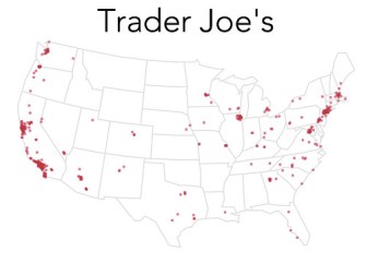 Again, judging solely from the map, an arch enemy of Publix: competing for the same turf in Florida – but on the other hand, absent from most of Georgia, all of South Carolina (except for that one, lonely dot) and Tennessee.