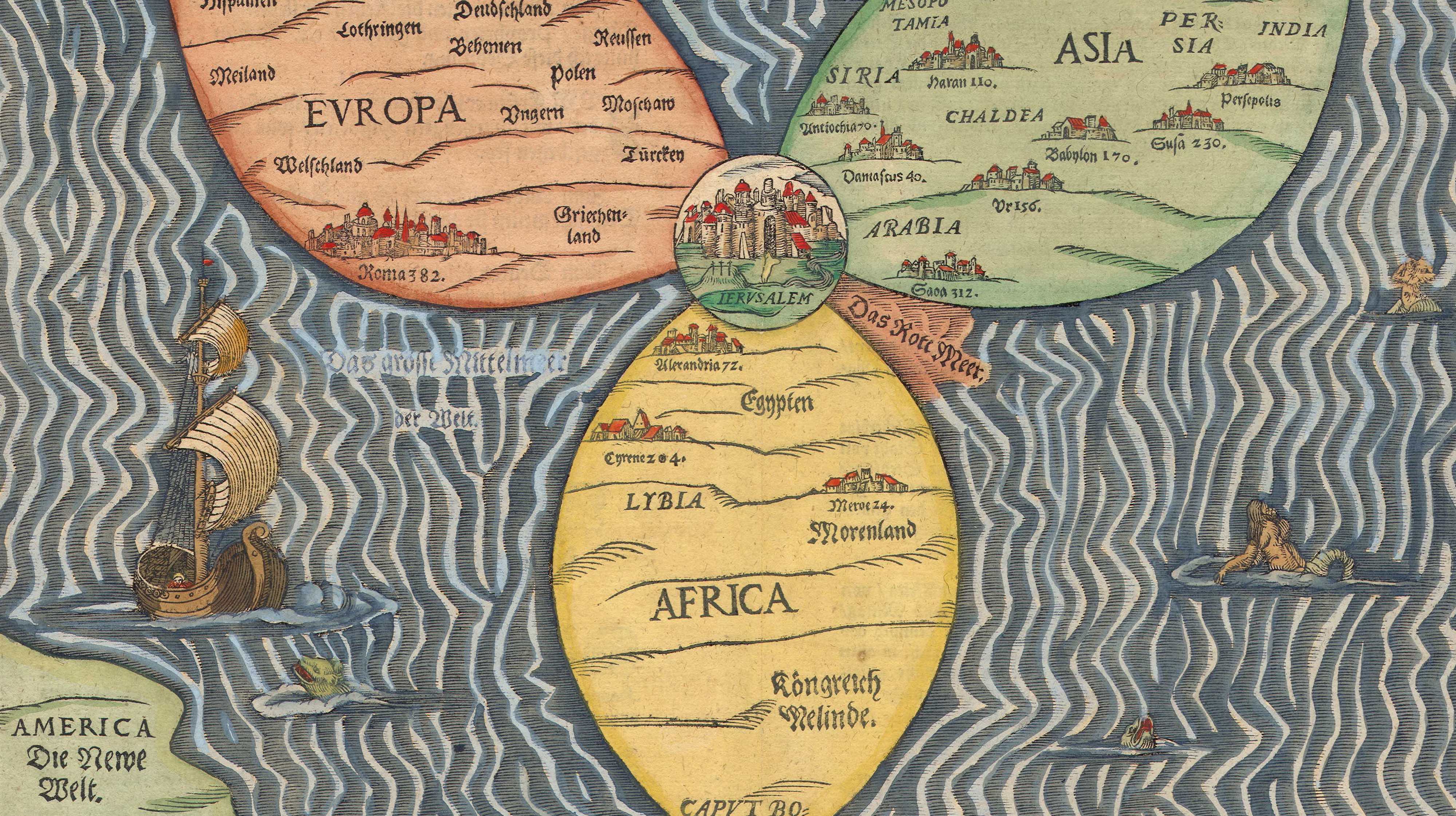 A beautiful map from the time when symbolic cartography was giving way to the Age of Discovery
