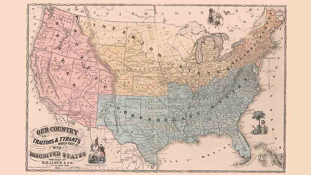 The map title reads: “Our Country as Traitors & Tyrants Would Have It; or Map of the Disunited States”. It was published in New York by H.H. Lloyd & Co. In blue, it shows a maximalist version of the Confederate States of America (CSA).