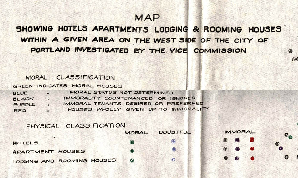 This map tells a different story, and isolates a single element from the topography of Portland: the moral standing of the city’s rentable rooms in the year 1913.