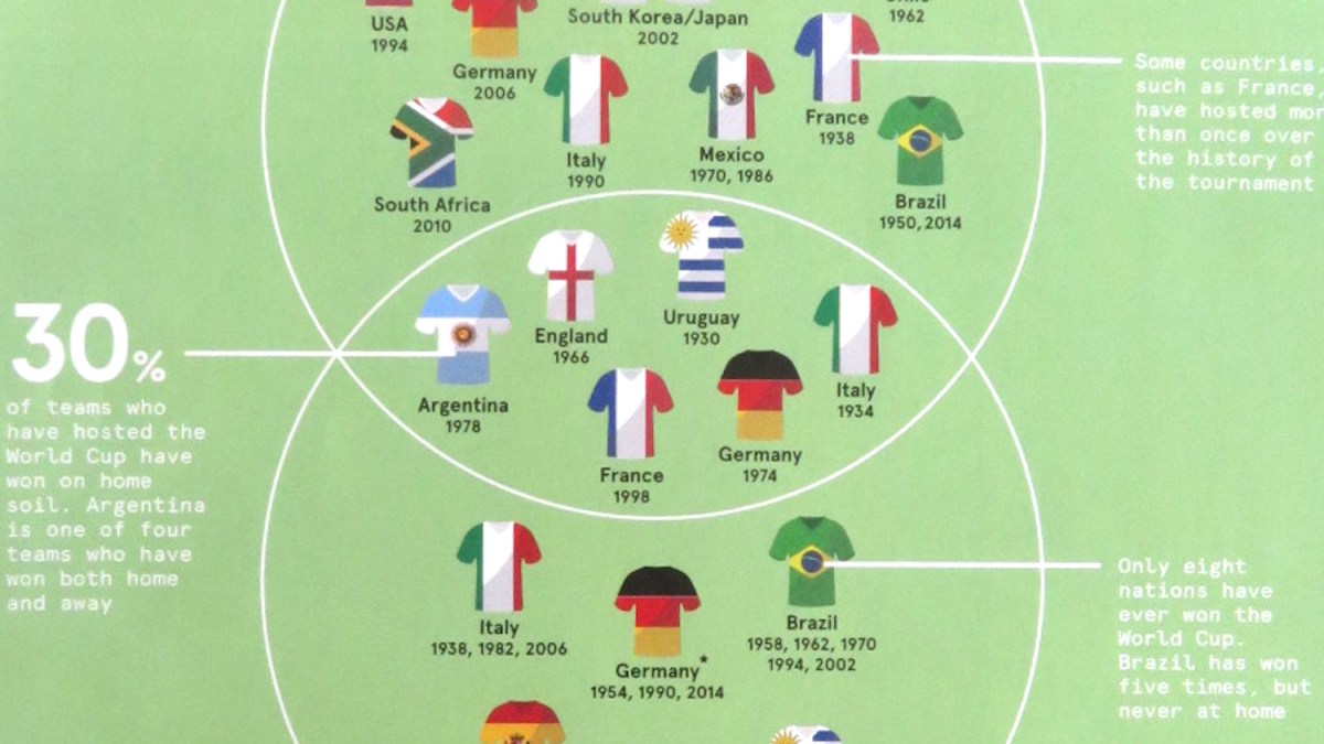 As the top of the diagram shows, many more countries have hosted the World Cup without winning it. The bottom of the diagram shows countries winning the Cup away from home. In all, just eight countries have ever won the Cup. Apart from the six mentioned above, also Spain and Brazil.