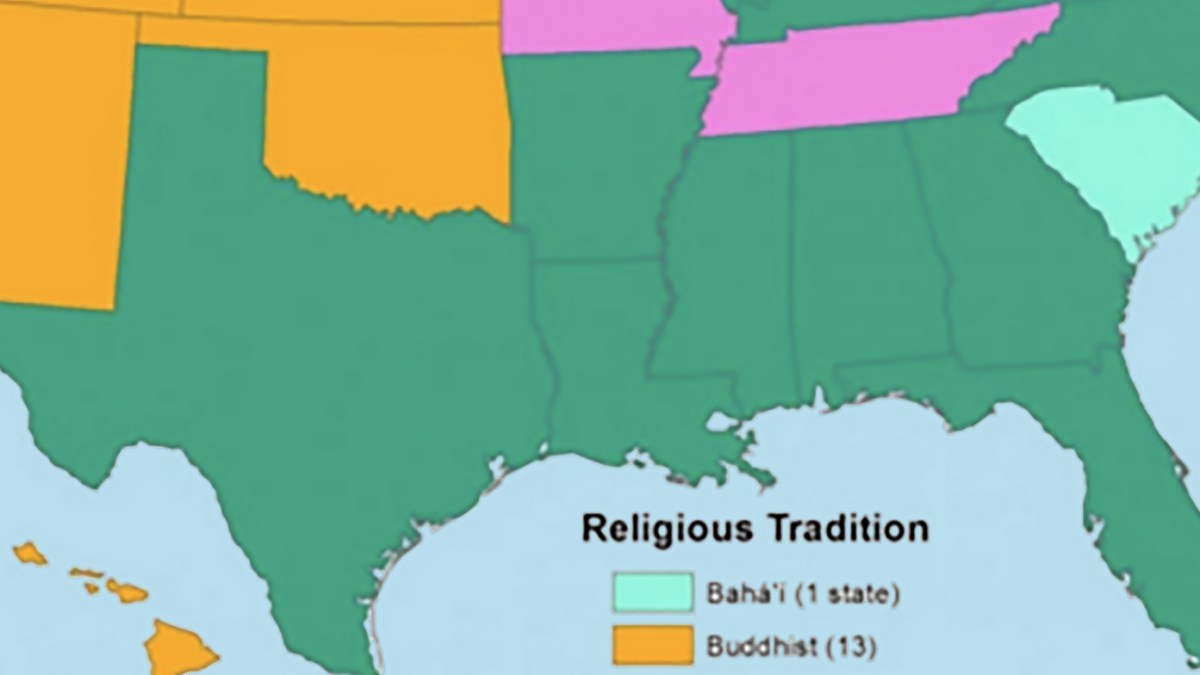 In our world, Christianity is the biggest religion in each state of the Union. But in the alternate-universe, non-Christian America of this map, the nation is divided between three main faiths (and two smaller ones).