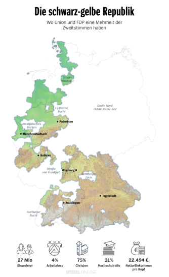 Ideologically, a Black/Yellow Republic makes more sense than a tripartite coalition with the Greens, but CDU/CSU and FDP together garnered less than 50% of the vote; it is unlikely that Merkel would want to lead a minority government, dependent on the support of parties outside her coalition. The Black/Yellow Republic shown here consists of the electoral districts where christian-democrats and liberals did manage to get at least half of the votes: a solid block in the south, a less solid block in the north; in all, about half of the old West Germany.
