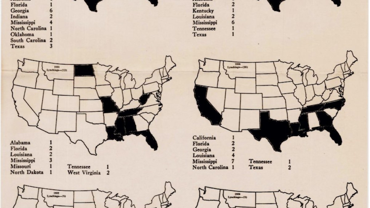 These maps, published in 1939, show the lynchings for each of the preceding years in the 1930s, from starting top left (1930) to bottom left (1933), then top right (1934) to bottom right (1937), with 1938 at the very bottom.