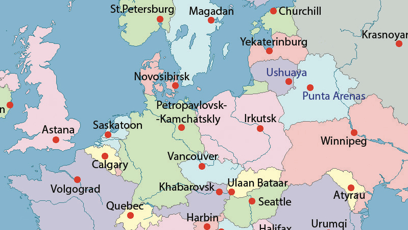 Berlin, Germany’s cosmopolitan capital, gets a make-over as Petropavlovsk-Kamchatsky, a frontier town and the only city on the Kamchatka Peninsula in Russia’s Far East. Oslo becomes the stylish former capital of St. Petersburg, while Stockholm has to settle for Magadan, the Far Eastern city the name of which once was synonymous with the Gulag Archipelago.